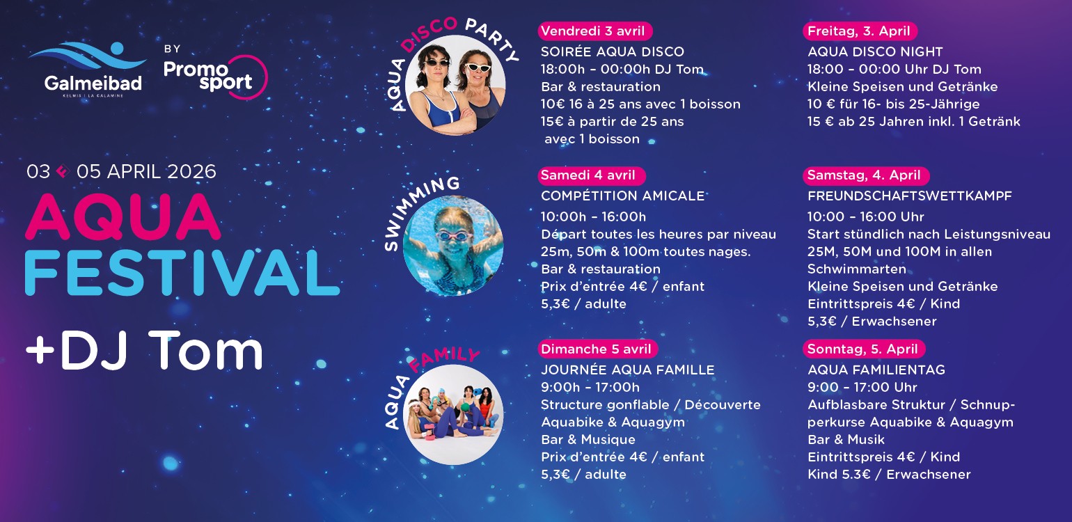Le 5 avril, les familles seront à l'honneur : lors de la journée familiale, tout tournera autour des jeux et du plaisir dans l'eau, avec notamment des cours de sport organisés par la piscine Galmeibad et des jeux pour les jeunes (et plus âgés) visiteurs :)